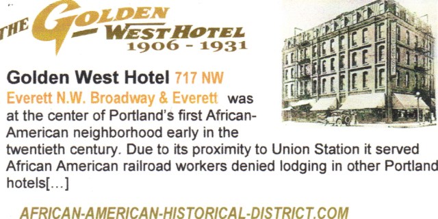 The Golden West Hotel was a vibrant place of employment and socializing for Portland’s African American community in the early 1900s. Display panels and audio narrative detailing this history can be found on the W.