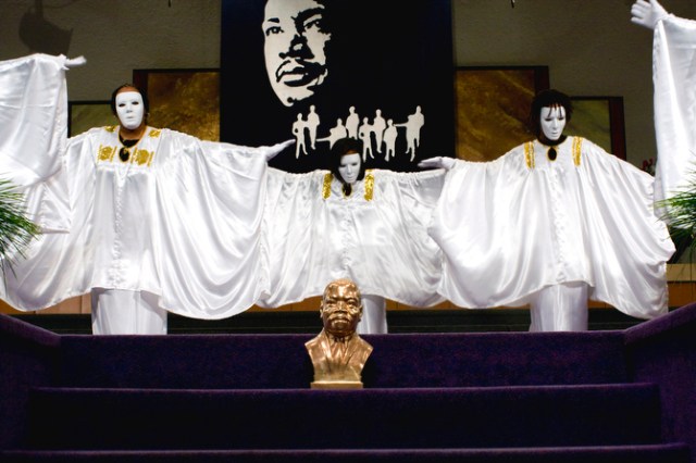 The Highland Christian Center mimes perform Monday at the Highland Christian Center during the biggest MLK Day celebration in Portland. The solid brass bust of Dr. King belongs to Ken Berry who produces the event. He says it was cast from a ceramic owned by his mother and made by Steve Flowers who lived in Portland and died last year. The bust weighs more than 100 pounds. Berry says the bust only leaves his house for the MLK celebration and has been present at 23 of the 24 celebrations at Highland Christian Center. Jamie Francis/The Oregonian