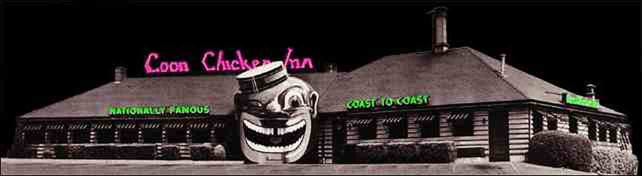 source: BLACKINFORMANT.COM Curator’s Notes: The Coon Chicken Inn was a highly successful restaurant chain from the late 1920s through the 1950s. A grinning, grotesque head of a bald Black man with a porter’s cap and winking eye formed a restaurant’s entryway. The door was through the middle of his mouth. The restaurants sold southern fried Coon Chicken sandwiches, chicken pie, livers — and hamburgers, seafood, chili, cakes, and assorted sandwiches. When possible, Blacks were used as waiters, waitresses, and cooks. The grandson of its founder wrote a brief history of the Coon Chicken Inn chain. We thank him for allowing us to print his account. (from the Jim Crow Museum of Racist Memorabilia)